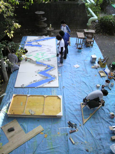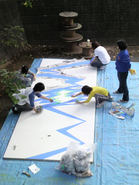 一枚目は塗り風景です。大物なので皆頑張ってます。まきさんが下で一人ポツンとしてますがはぶられて落ち込んでるのではなく作業してます。